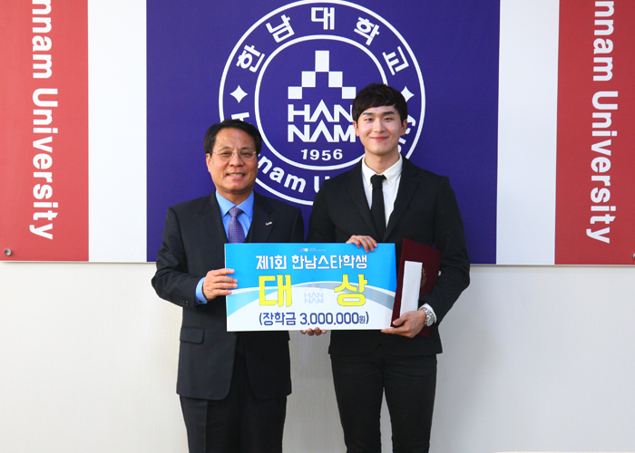 ▣ 이덕훈 총장(사진 왼쪽)이 한남대 스타 학생 중 대상으로 선정된 신용대 씨에게 장학금 3백만 원을 전달하고 있다.