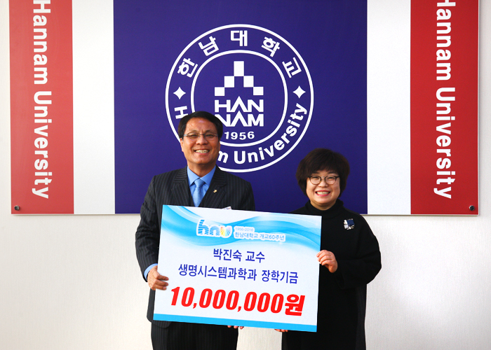 본교 생명시스템과학과 박진숙 교수는 12일 이덕훈 총장에게 1,000만 원의 학과장학기금을 전달했다.
